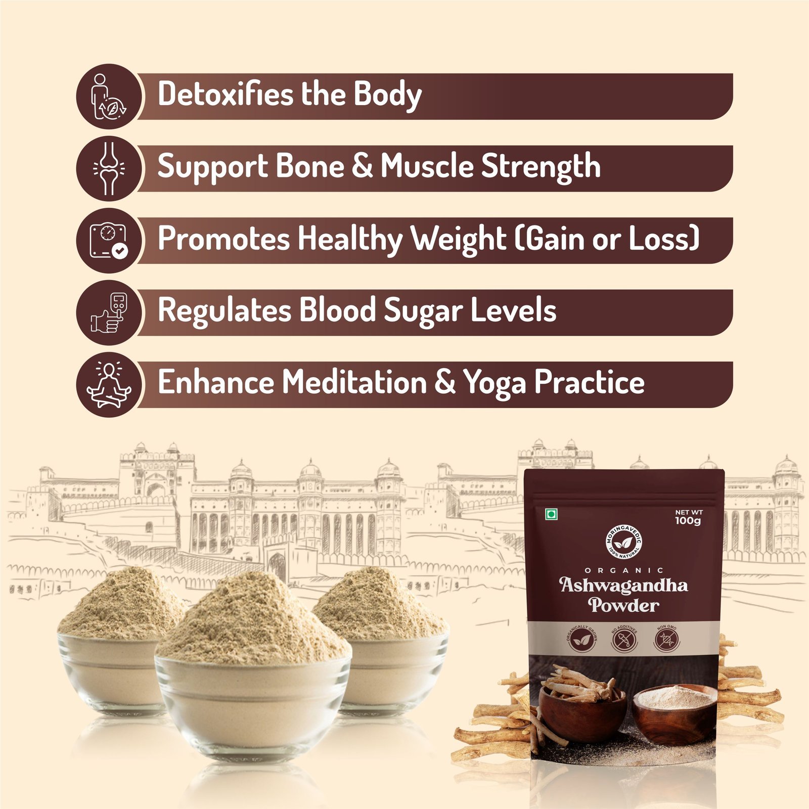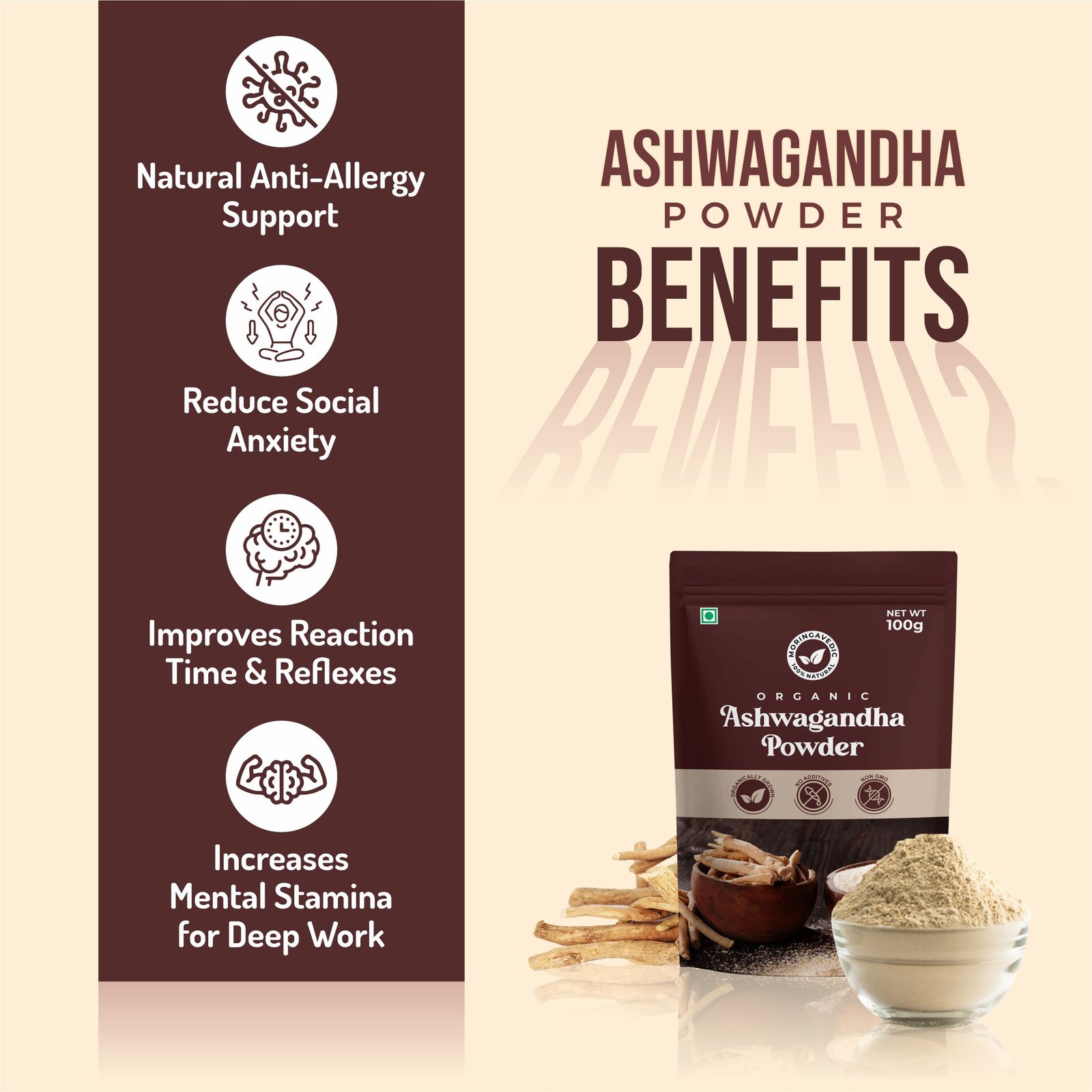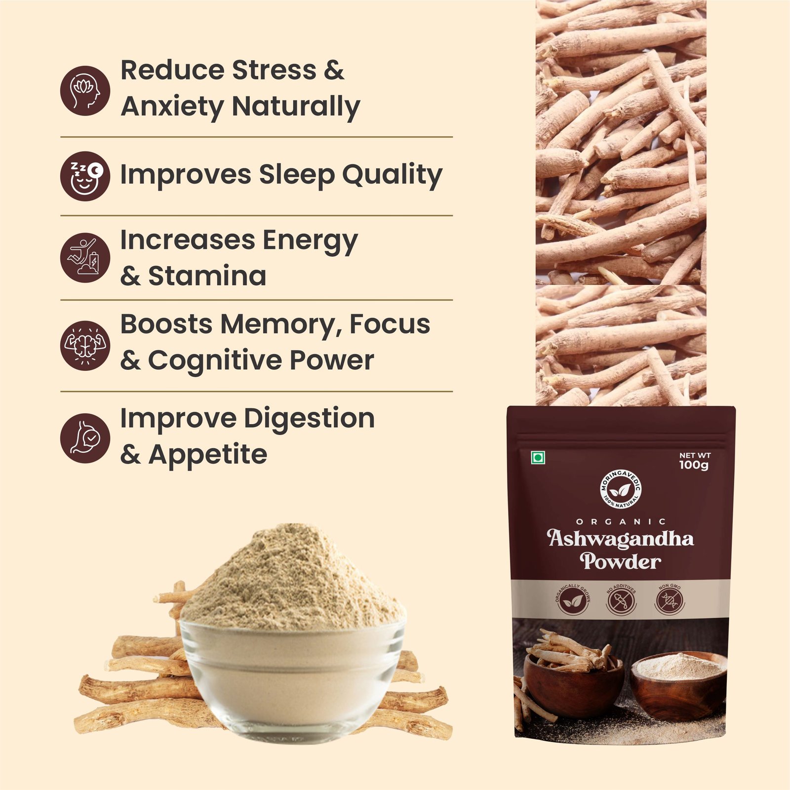 Moringa Vedic Ashwagandha Powder is a natural adaptogen rooted in Ayurveda. Known for its calming effects, it helps reduce stress, restore energy, and improve overall well-being, making it a perfect daily wellness supplement.
